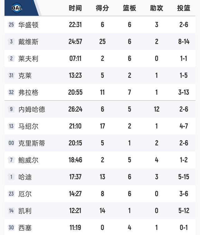 独行侠这边浓眉发挥神勇,他在内线几乎无人能敌,投篮10投5中轰下17分3篮板2助攻1抢断1盖帽;状元弗拉格展示天赋,整体发挥低开高走,投篮8中2得到8分5篮板1助攻1抢断1盖帽;克莱的手感一般,三分球2投全失,得到5分2篮板1助攻1抢断;马绍尔成为奇兵,投篮5中3贡献14分2篮板。
