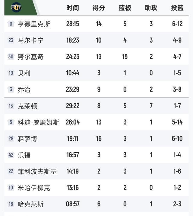 上半场爵士这边发挥比较亮眼的是马尔卡宁,他投篮9中4得到10分4篮板3助攻;老将努尔基奇外线手感不俗,命中2记三分得到6分8篮板2助攻;小将森萨博异军突起轰下8分1篮板。
