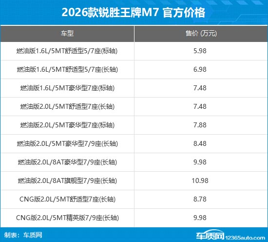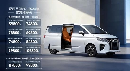 12月31日,2026款锐胜王牌M7正式上市,售价区间5.98-10.98万元。新车主要在配置上进行了微调,并增加新的内饰配色。另外,本次上市的车型覆盖燃油、CNG两种动力,将为消费者带来更多选择。