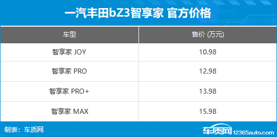 12月31日,一汽丰田bZ3智享家迎来正式上市,共推出4款车型,售价区间为10.98-15.98万元,其中智享家 JOY和智享家 PRO限时焕新价分别为9.38万元和10.38万元。新车搭载激光雷达,支持ILPP记忆泊车等多项辅助驾驶功能。