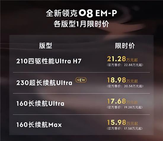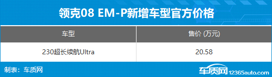 1月1日,车质网从官方获悉,领克08 EM-P新增加一款230超长续航Ultra版可选,官方指导价20.58万元,限时优惠价为18.98万元。